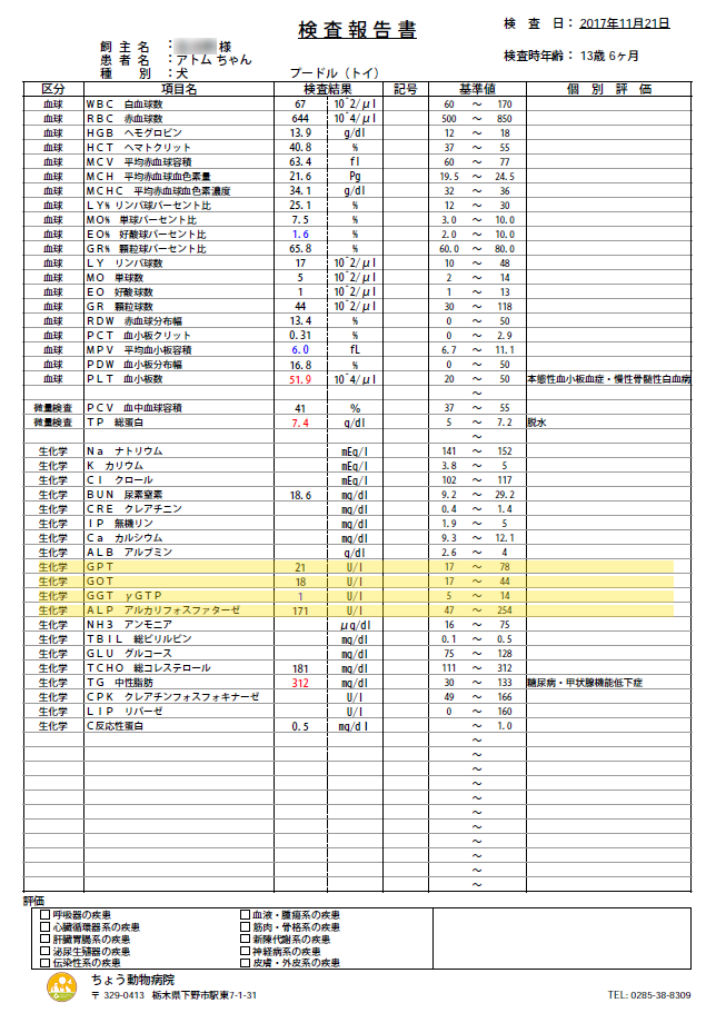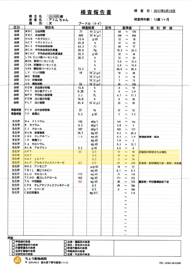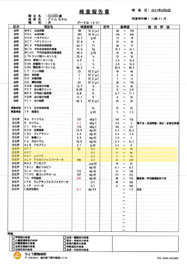 アトム君は2014年2月よりウルソを服用しており、内服中2017年春頃まで肝酵素が安定していましたが、6月の検査時にGPT85、ALP321と数値の上昇が見られました。
