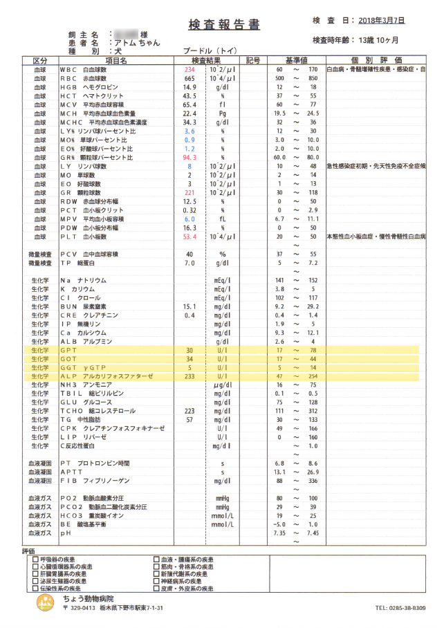 2016年の血液検査ではGPTが535(ALPは124と正常値でした)だったため、ウルソの服用を開始しました。その後内服により一旦はGPTの下降がみられたものの、内服が切れると上昇してしまうことから継続的な内服治療を始めました。